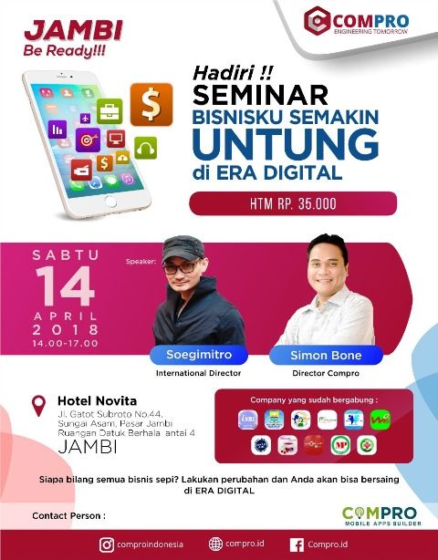 Adapun pada acara yang digelar Compro ini akan mengadirkan International Director Soegimitro dan Director Compro Simon Bone. Acara aka digelar di Hotel Novita yang berada di Jalan Gatot Subroto,