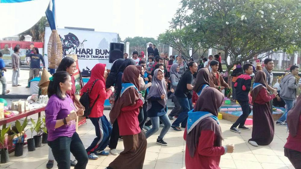 Rupanya mereka melakukan kegiatan dan kampanye peduli lingkungan untuk memperingati hari bumi. Sontak kegiatan yang dilakukan di tengah Car Free Day di kawasan Gubernuran ini menjadi pusat perhatian masyarakat yang berlalu lalang.