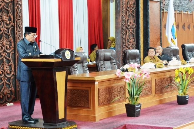 JAMBERITA.COM- Pelaksana Tugas (Plt) Gubernur Jambi, Fachrori Umar menyampaikan Nota Pengantar Rancangan Awal Perubahan Rencana Pembangunan Jangka Menengah Daerah (RPJMD) Provinsi Jambi Tahun 2016-2021 dalam Rapat Paripurna DPRD Provinsi Jambi, Senin (28/5/18) siang.