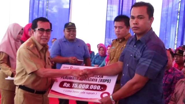 Penyerahan bantuan stimulan perumahan swadaya (BSPS) kepada warga ini berlangsung di halaman kantor camat Tanah Kampung.