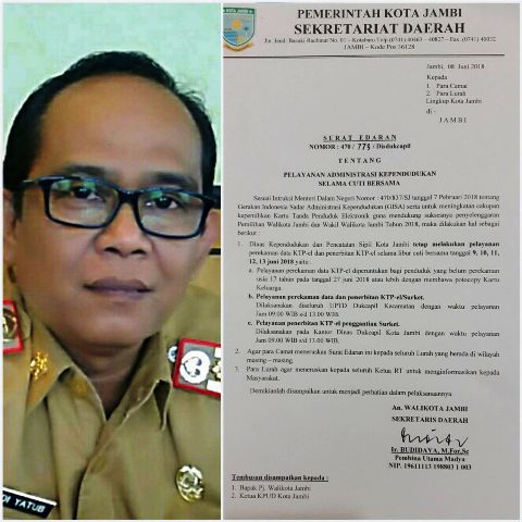 Ini berdasarkan Surat Edaran yang ditandatangani Sekda Kota Jambi Budidaya. Dalam surat edaran ini, selama libur dan cuti bersama dari tgl 9 s/d 13 juni 2018 Dinas Dukcapil Kota Jambi Tetap memberikan pelayanan bagi masyarakat untuk perekaman data KTP-el dan penerbitan KTP-el di seluruh kantor UPTD Dukcapil Kecamatan dan Kantor Dinas Dukcapil Kota Jambi.