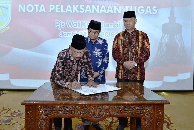 JAMBERITA.COM- PLT Gubernur Fachrori Umar menghadiri Serah terima Nota Pelaksanaan Tugas dan Pisah Sambut Penjabat Sementara Walikota Jambi Muhammad Fauzi kepada Walikota Jambi, Syarif Fasha di Aula Rumah Dinas Walikota Jambi, Minggu (24/6/2018).