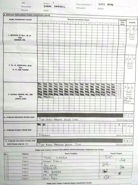 Di TPS 01 Desa Kota Iman ini jumlah yang memberikan hak suara sebanyak 393 suara. Dari total suara tersebut Zainal-Arsal memperoleh 385 suara.