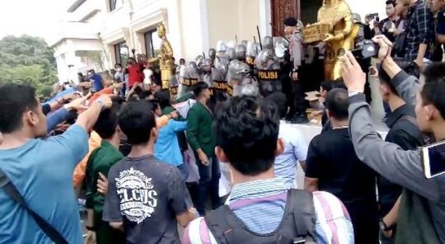 JAMBERITA.COM - Puluhan mahasiswa yang tergabung dalam Aliansi Mahasiswa Jambi berunjuk rasa di DPRD Provinsi Jambi (13/09/2018). Mereka tidak diperkenankan masuk, karena pada saat yang sama sedang berlangsung rapat paripurna di dalam gedung.