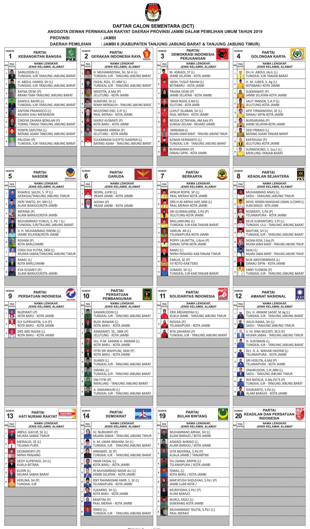 JAMBERITA.COM - KPU Provinsi Jambi dan 11 Kabupaten/Kota sudah menetapkan daftar calon tetap (DCT) anggota DPRD. Itu Artinya para kandidat wakil rakyat tersebut sudah resmi menjadi calon legislatif (Caleg) untuk Pemilihan Umum (Pemilu) 2019.