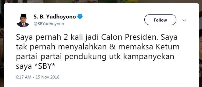 Jawaban ini ditulisnya twitannya di akun Twitternya @Sbyudhoyono, Kamis (15/11/2018). Dimana, Ia meminta pasangan calon presiden dan wakil presiden nomor urut 02 Prabowo Subianto-Sandiaga Uno fokus untuk memaparkan kebijakan dan programnya kepada masyarakat.