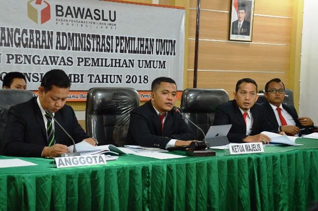 JAMBERITA.COM- Badan Pengawas Pemilu (Bawaslu) Provinsi Jambi menggelar sidang dugaan pelanggaran administrasi yang dilakukan calon anggota legislatif (caleg) Hanura untuk DPRD Provinsi Jambi Dapil 6 atas nama Merialdi di Kantor Bawaslu Provinsi Jambi Rabu (21/11/2018).