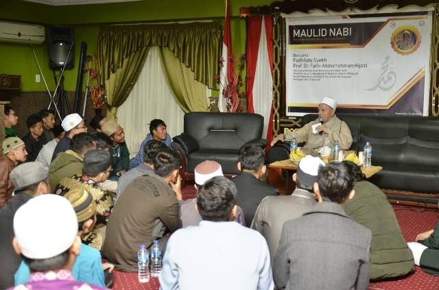 MESIR - Kekeluargaan Mahasiswa Jambi (KMJ) Mesir menggelar Maulid Nabi bersama dua syekh besar Azhar, Syekh Prof. Dr. Fathi Abdurrahman Hijazi (Guru Besar Bahasa Arab Universitas Al-Azhar Kairo) dan Syekh Muhammad Aliywah (Imam Besar Masjid Al Azhar) di Auditorium Darul Hasan, Hay Asyir, Madinat Nasr (29/11/2018).