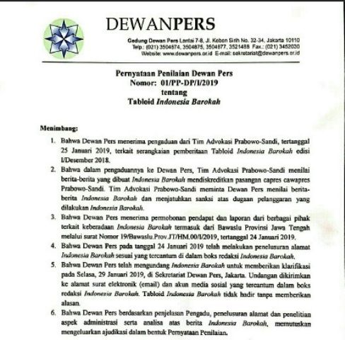 2. Tim Advokasi Prabowo-Sandi dalam pertemuan pada Jumat, 25 Januari 2019, di Sekretariat Dewan Pers, Jakarta, menjelaskan bahwa beria Indonesia Barokoh mengandung fitnah, hoaks, dan mendiskreditkan pasangan capres/cawapres Prabowo-Sandi.