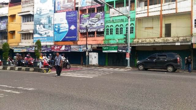 JAMBERITA.COM- Suasana ruko di kawasan Pasar, kota Jambi lengang. Daerah yang biasanya ramai kini terlihat sepi karena sebagian besar pemilik ruko yang merupakan keturuna Tionghoa sedang merayakan imlek.
