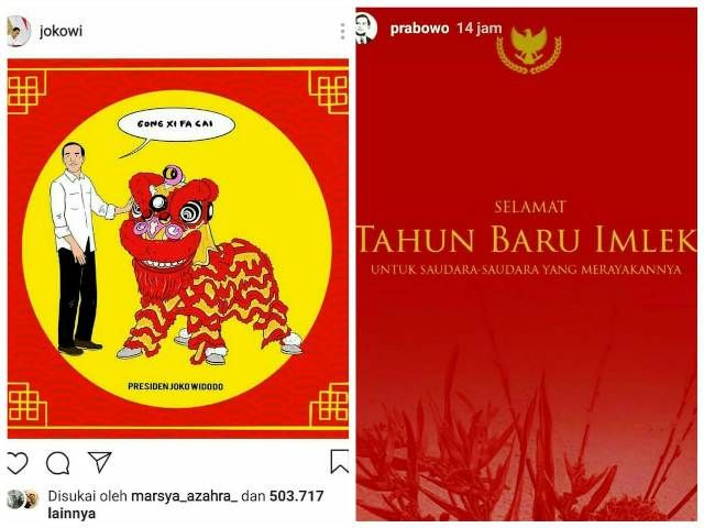 Sementara itu, Capres Prabowo Subianto mengucapkan selamat tahun baru Imlek melalui Instagram-nya. Prabowo mengunggah ucapan selamat itu dalam Insta Story-nya yang berbentuk seperti poster digital. "Selamat Tahun Baru Imlek, untuk saudara-saudara yang merayakannya," tulis capres nomor urut 02 itu.