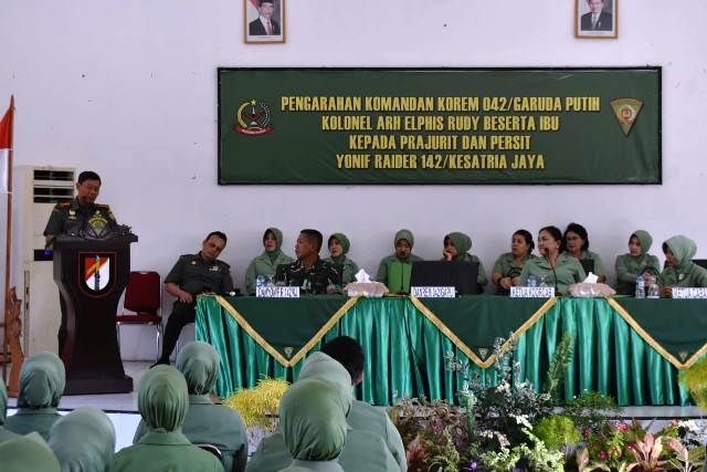 Hal itu ditegaskan Danrem saat mengunjungi satuan jajarannya di Markas Yonif Raider 142/KJ yang berada di di kawasan Kasang, Kecamatan Jambi Timur, Kota Jambi, Kamis (14/3/2019), kepada 250 orang anggota dan Persit Danrem 042/Gapu.