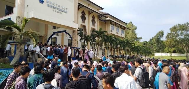 JAMBERITA.COM - Ratusan mahasiswa Universitas Islam Negeri (UINS) Provinsi Jambi menggelar aksi demonstrasi di depan Gedung Rektorat, Rabu (20/3/2019).