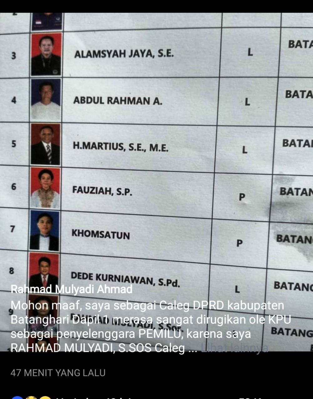 Rahmat meluapkan kekesalannya lewat postingannya di akun facebook. “Mohon maaf, saya sebagai Caleg DPRD kabupaten Batanghari Dapil 1 merasa sangat dirugikan ole KPU sebagai penyelenggara PEMILU, karena saya RAHMAD MULYADI, S.SOS Caleg Partai NASDEM nomor urut 9 dipasang foto perempuan oleh penyelenggara PEMILU pada kertas pada Papan Pengumuman daftar Caleg yang menjadi hak publik Caleg dan pemilih. Saya sangat merasa dirugikan dengan kejadian ini. Saya akan gugat,” tulisnya.
