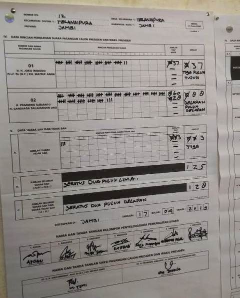 Hasilnya, di TPS dimana tempat Ketua Badan Pemenangan (BPD) Prabowo-Sandi Jambi, perolehan suara untuk Pilpres dimenangkan telak oleh pasangan Prabowo-Sandi dengan jumlah 88 suara.