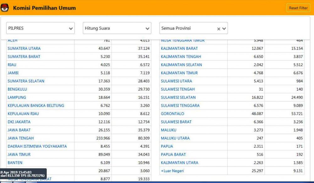 Adapun data masuk masih sedikit yakni 0,78232 persen. Dimana data TPS yang masuk 6.363 TPS dari 813.350. Data ini terpantau hari ini Kamis (18/4/2019) dengan update terakhir 15.45.