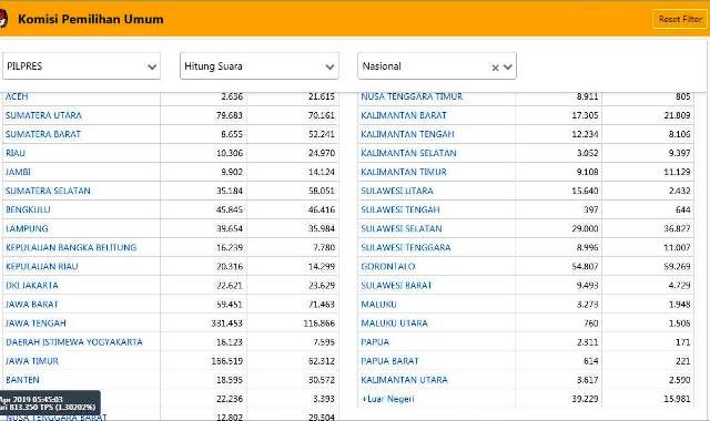 Data yang kami ambil pada 19 April 2019 update 05.45, perolehan suara 01 sebesar 56,39 persen dengan jumlah suara 1.136.967. Sedangkan Pasangan Prabowo-Sandi mendapatkan 43,61 persen dengan perolehan suara 879.346.