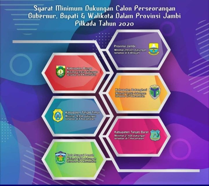 Sekedar ulasan, KPU di Provinsi Jambi yang melaksanakan pilkada sudah tetapkan angka minimal dukungan untuk jalur perseorangan. Untuk Jambi sendiri dukungan minimal adalah 210.431 dan harus tersebar di 6 kabupaten/kota. 23.932 untuk Bungo dan tersebar di 9 kecamatan serta untuk Batanghari 19.263 tersebar di 5 kecamatan. Untuk Sungai Penuh minimal dukungan yang harus dikumpulkan adalah 6.604 tersebar di 4 kecamatan. Tanjab Barat minimal dukungan 21.478 tersebar di 7 kecamatan dan terakhir Tanjab Timur yang harus kumpulkan dukungan minimal 16.858 dan tersebar di 6 kecamatan.