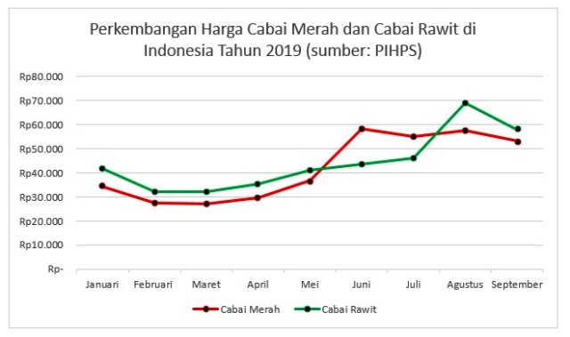 Harga cabai yang melonjak tinggi akan merugikan konsumen, sebaliknya harga cabai yang menurun drastis akan merugikan petani. Biasanya, kenaikan harga cabai terjadi saat menjelang hari raya sebab permintaan cabai yang melonjak sekitar 10-20% dari kebutuhan normal. Pada Agustus 2019, Badan Pusat Statistik (BPS) mencatat harga cabai rawit naik 25,76 persen dan harga cabai merah naik 10,87 persen dari bulan sebelumnya, mengingat IdulAdha 1440 H terjadi di bulan tersebut.