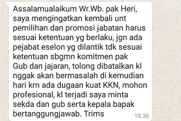 "Assalamualaikum wr.wb Pak Heri, saya mengingatkan kembali untuk pemilihan dan promosi jabatan harus sesuai ketentuan yg berlaku, jgn ada yg ada pejabat eselon yg dilantik tidak sesuai ketentuan sebagaimana komitmen Pak gub dan jajaran," tambahnya. "tolong dibatalkan Kl nggak bermasalah di kemudian hari, karena ada dugaan kuat KKN, mohon profesional, kalau terjadi saya minta Sekda dan gub serta kepala bapak bertanggung jawab. Trims," bunyi pesan yang beredar.