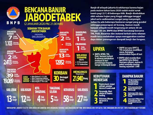 Sebagai tindak lanjut Rapat Koordinasi Penanganan Bencana banjir Jabodetabek pagi ini di BNPB yaitu agar semua pihak berkoordinasi dan saling bersinergi. BNPB melakukan sinkronisasi dan validasi data korban bencana banjir. Data dikumpulkan oleh BNPB dari Pusat Krisis Kementerian Kesehatan, Kementerian Sosial, BPBD, TNI, POLRI, dan sumber lainnya. Sampai dengan pukul 21.00 WIB jumlah korban meninggal akibat banjir adalah 30 orang.
