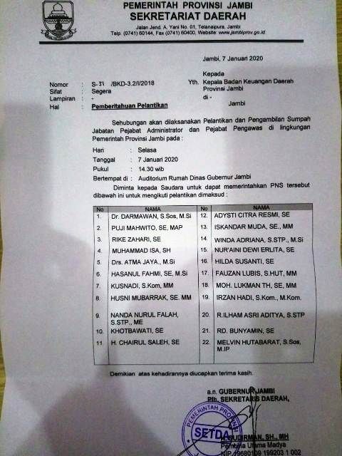 Rencana pelantikan diawali dengan Pelantikan Sudirman PLH ke Pejabat Sekda yang akan berlangsung di rumah dinas Gubernur sekitar pukul 13.00 WIB dikawasan Ancor Sungai Batanghari.