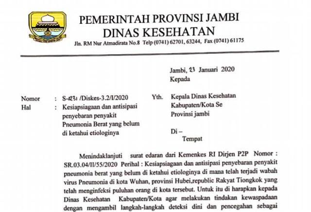 JAMBERITA.COM - Dinas Kesehatan (Dinkes) Provinsi Jambi melayangkan Surat Edaran (SE) kesiapsiagaan dan antisipasi penyebaran penyakit Pneumonia yang belum diketahui etiologinya dari Tiongkok.