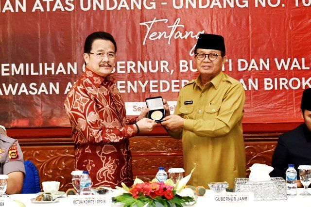 Rapat Kerja Komite I DPD RI ke Provinsi Jambi dalam rangka Inventarisasi Materi Rancangan Undang Undang (RUU) tentang Perubahan atas Undang Undang Nomor 10 Tahun 2016 terkait Pemilihan Gubernur, Bupati dan Walikota, serta Pengawasan atas Penyederhanaan Birokrasi di Daerah. Komite I DPD RI yang hadir adalah Dr.Agustian Teras Narang sebagai Ketua Komite, H.Fachrul Razi,M.IP sebagai Wakil Ketua Komite dan anggotanya adalah Kh.Amang Syafrudin,Lc., Dra.Eni Khairani,M.Si, Istiawati Ayus,SH,MH., Dr.Shri I.G.N Arya Wedakarna serta anggota DPD RI Dapil Jambi, H.M.Syukur,SH,MH.