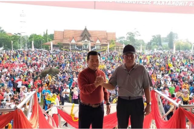JAMBERITA.COM- Kandidat Bakal Calon Gubernur Jambi Al Haris bersama Ketua Umum Wisnu Murti Provinsi Jambi Ustadz Abdullah Sani (UAS), senam pagi di lapangan Taman Rimba Jambi, Minggu (23/2/2020).