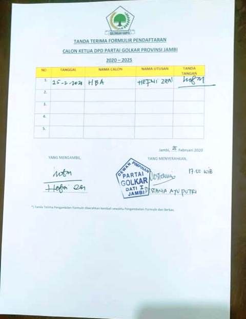 JAMBERITA.COM- Usai Steering Commitee (SC) Musyawarah Daerah (Musda) X DPD I Partai Golkar Provinsi Jambi mengumumkan bahwa dimulainya pendaftaran, ternyata hari ini, Selasa (25/2/2020) sudah ada yang mengambil formulir pendaftaran.