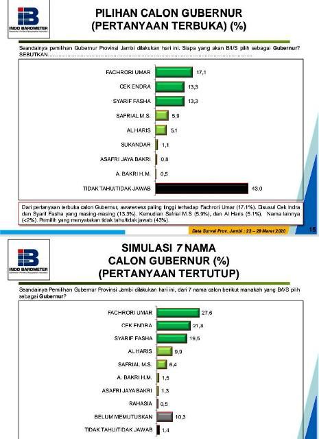 Lebih rinci, hasil yang didapat oleh FU ini sendiri berada diangka 17.1 persen pada pertanyaan terbuka dan pertanyaan tertutup sebesar 27.6 persen. Dibawahnya tetap ada nama Cek Endra, Sy Fasha, Al Haris dan Safrial.