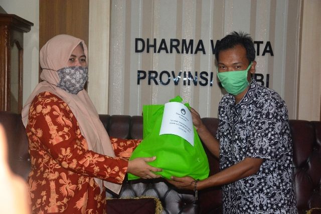 JAMBERITA.COM – Dalam suasana pandemi Virus Corona (Covid-19), dengan dampak ekonomi yang sangat besar bagi masyarakat, Dharma Wanita Persatuan (DWP) Provinsi Jambi turut berkontribusi untuk meringankan beban masyarakat yang mengalami dampak ekonomi akibat Covid-19 tersebut. DWP Provinsi Jambi membagikan bantuan berupa paket sembako untuk masyarakat di seputaran Kantor DWP Provinsi Jambi, panti sosial, dan pegawai golangan I, dalam penanganan dampak Pandemi Covid-19, bertempat di kantor DWP Provinsi Jambi, Jambi Pasar, Kamis (23/04/2020).
