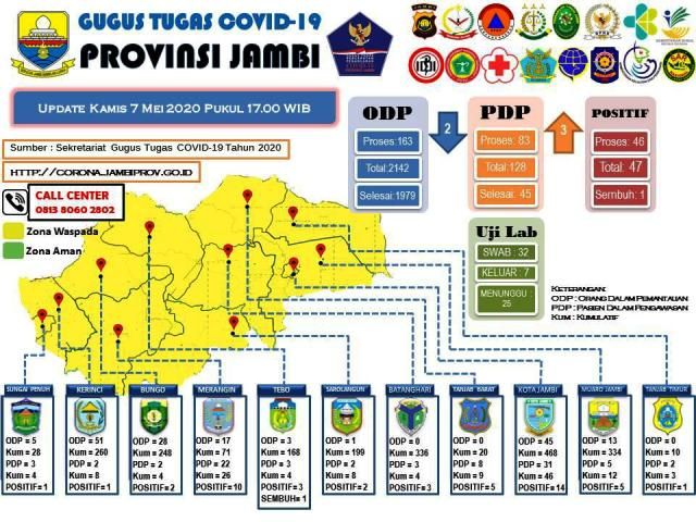 JAMBERITA.COM - Kasus terkonfirmasi Corona Virus Disease (Covid-19) Provinsi Jambi hari ini, Kamis (7/5/2020) tetap sama dengan kemarin yakni 47 kasus. Namun jumlah Pasien Dalam Pengawasan (PDP) mengalami peningkatan.