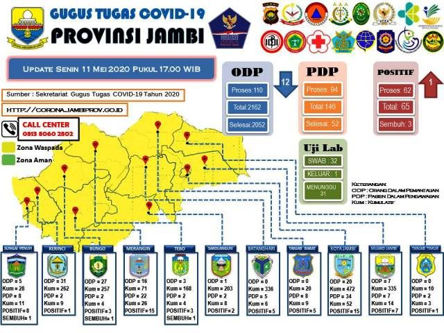 Untuk diketahui bahwa saat ini jumlah kasus terkonfirmasi positif di provinsi Jambi totalnya 65 kasus, tiga pasien dinyatakan sembuh dan 62 pasien tengah menjalani perawatan.