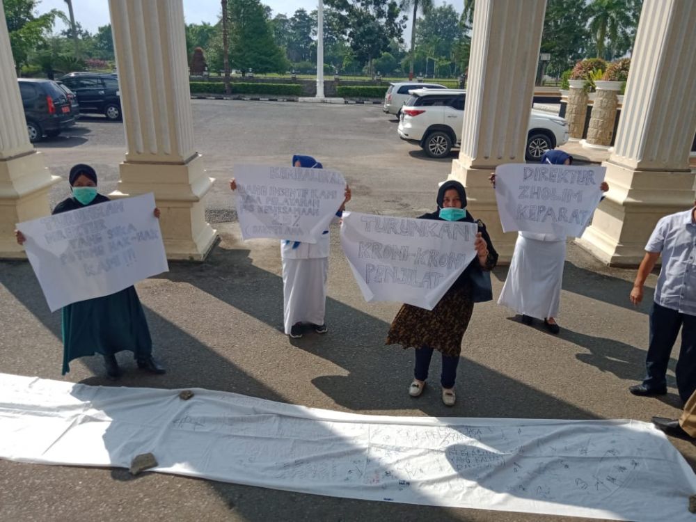 Mereka meminta kroni-kroni penjilat di RSUD Raden Mattaher Jambi itu segera di turunkan."Turunkan direktur yang suka potong hak hak kami, Direktur zholim keparat, kembalikan insentif kami, bukti ada," jelasnya.
