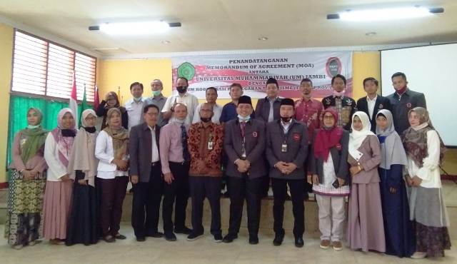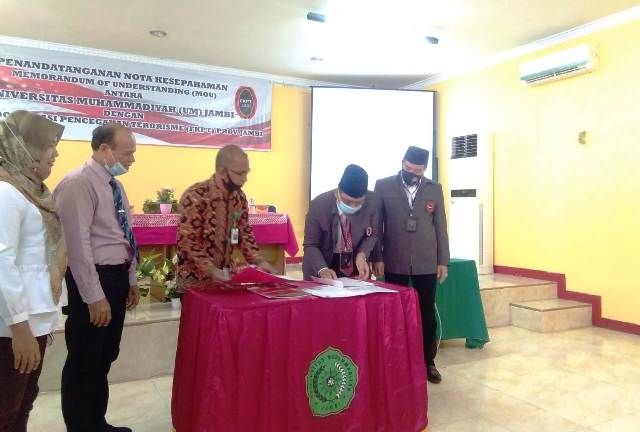 JAMBERITA.COM- Forum Koordinasi Pencegahan Terorisme (FKPT) Provinsi Jambi melakukan penandatanganan MOU dan MOA dengan Universitas Muhammadiyah Jambi, Rabu (1/7/2020).