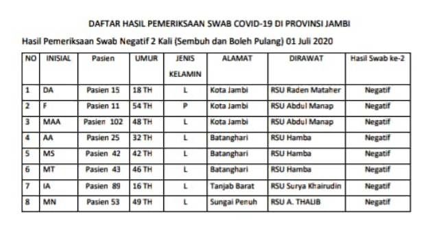 Juru bicara penanganan Covid-19 Provinsi Jambi Johansyah dalam keterangan tertulisnya menjelaskan delapan pasien tersebut yaitu pasien 15, 11, 102, 25, 42, 43, 89, 53.