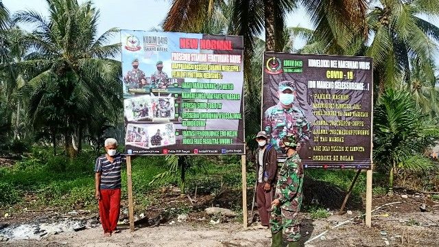 JAMBERITA.COM- Personel Satgas TMMD Ke-108 TA. 2020 Kodim 0419/Tanjab bersinergi bersama Masyarakat memasang Banner New Normal dalam rangka Pemutusan Mata Rantai Covid-19 bertempat di RT. 03 Parit 4 Dusun 2 Desa Labuhan Pring Kec. Sadu Kab. Tanjab Timur, Jambi, Minggu (5/7/2020).
