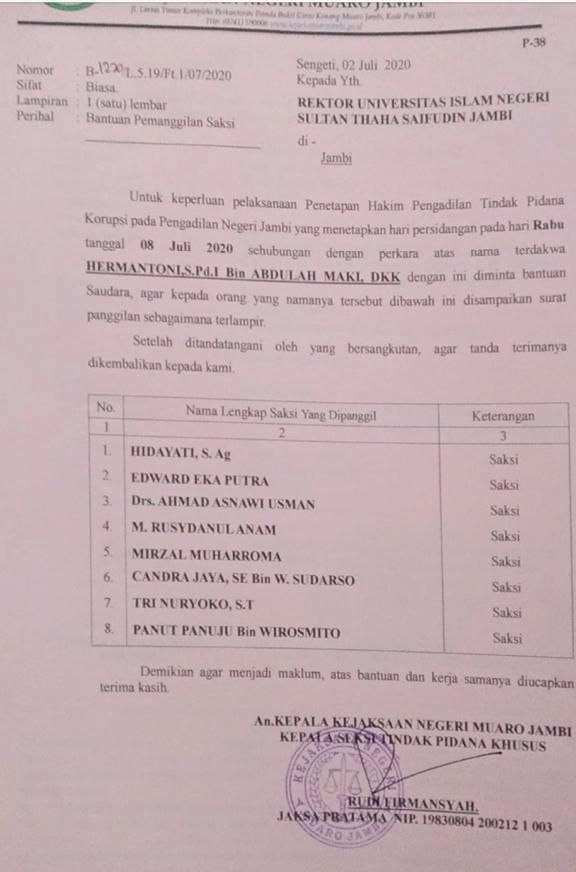 Berikut ini adalah para saksi yang dihadirkan berdasarkan surat yang didapat Jamberita.com yang ditandatangani langsung oleh Rudi Firmansyah selaku jaksa yang juga sebagai Kasi Pidsus Kejari Muaro Jambi.