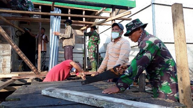 Tidak hanya Satgas yang tergabung dan bertugas dalam program ini, namun pemandangan gotong royong TNI dengan warga sangatlah kental dalam suasana kehangantan penuh kekeluargaan, seperti saat memperbaiki rumah keempat penerima program TMMD Bedah rumah tak layak huni, milik Hendri.