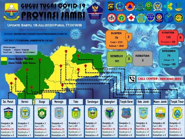JAMBERITA.COM - Hari ini jumlah terkonfirmasi positif Covid-19 naik cukup signifikan. Berdasarkan data tim gugus tugas penanganan Covid-19 Provinsi Jambi ada enam kasus baru di Provinsi Jambi, Sabtu (18/7/2020).