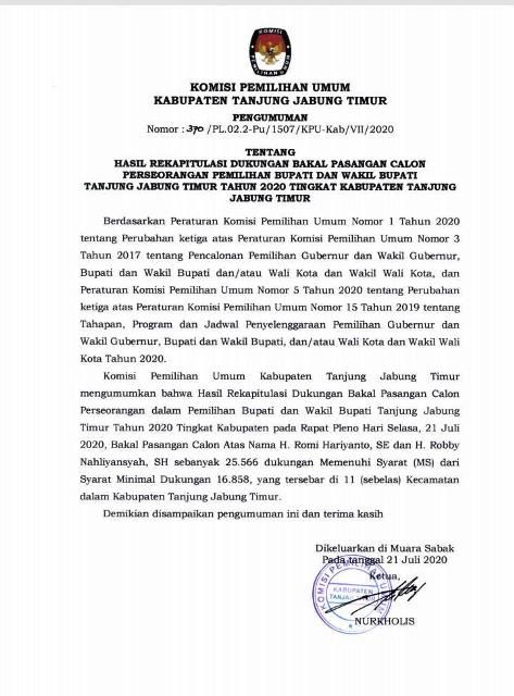 JAMBERITA.COM- KPU Tanjung Jabung Timur sudah merampungkan rekapitulasi hasil dukungan bakal calon perseorangan Romi Haryanto dan Robby Nahliyansah untuk Pilbup Tanjung Jabung Timur. Pleno yang digelar Selasa lalu ini memutuskan hasil dukungan calon petahana ini melebihi batas minimal dukungan.