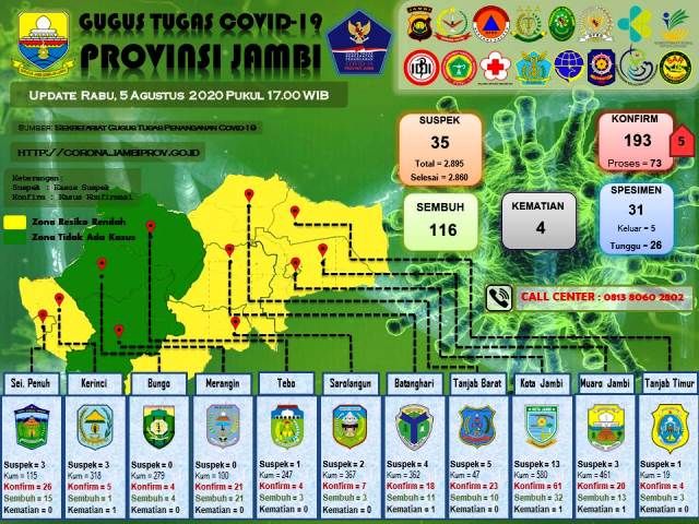Saat ini total keseluruhan pasien terkonfirmasi positif Covid-19 di provinsi Jambi sebanyak 193 orang, 4 pasien meninggal dunia, 116 pasien dinyatakan sembuh dan 73 orang dalam perawatan di rumah sakit. (sap)