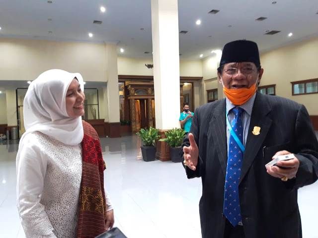 JAMBERITA.COM- Ketua DPD Demokrat Provinsi Jambi Burhanuddin Mahir terlihat menyapa ramah Ratu Munawarah saat bertemu usai paripurna di Gedung DPRD Provinsi Jambi.