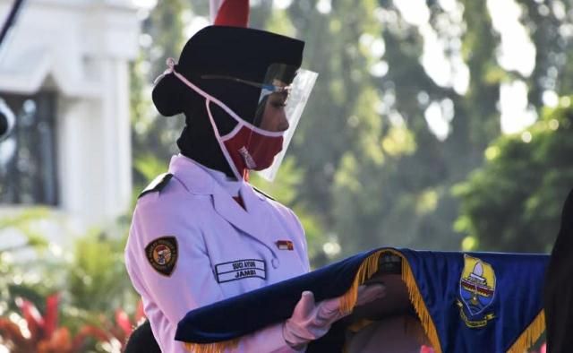 Sama hal nya dengan Purna Paskibraka yang kembali bertugas di Upacara HUT RI ke-75 di lapangan Kantor Gubernur Jambi Senin (17/8/2020).
