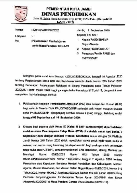 Kepala Dinas Pendidikan Muchlis, melalui surat edaran Dinas Pendidikan Kota Jambi Nomor 420/1373/DISDIK/2020 menjelaskan bahwa pelaksanaan pembelajaran siswa jarak jauh bagi siswa PAUD, TK, SD dan SMP sederajat diperpanjang selama dua minggu.