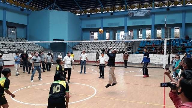JAMBERITA.COM- Fachrori Umar dan Syafril Nursal menjajal pertandingan Bola Voli di Gedung Olahraga (GOR), Kotabaru, Kota Jambi. Keduanya tampil usai membuka secara resmi Kejuaraan Bola Voli Gubernur CUP U-19, Sabtu (5/9).