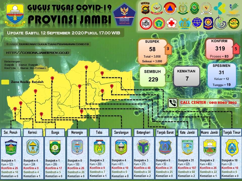 JMBERITA.COM - Jumlah kasus terkonfirmasi positif Covid-19 di Provinsi Jambi kembali bertambah. Tim gugus tugas Provinsi Jambi mengumumkan 5 pasien baru hari ini, Sabtu (12/9/2020).