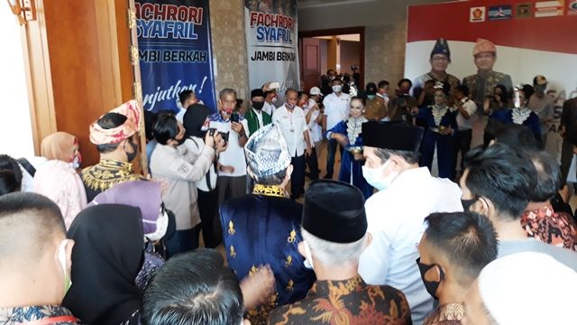 JAMBERITA.COM- Bakal Calon Gubernur dan bakal Calon Wakil Gubernur Jambi Fachrori Umar dan Syafril Nursal dihadang pedagang kaki lima saat tiba di lokasi deklarasi dan pelantikan tim Fachrori - Syafril di Ratu Convention Center (RCC) Jambi, Senin 14/09/20.
