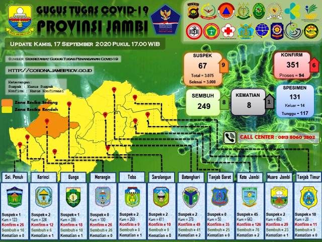 Hingga saat ini total keseluruhan pasien positif Covid-19 di Provinsi Jambi sebanyak 351 orang, 249 dinyatakan sembuh, 8 pasien meninggal dunia dan 94 sedang dalam perawatan di rumah sakit. (sap)